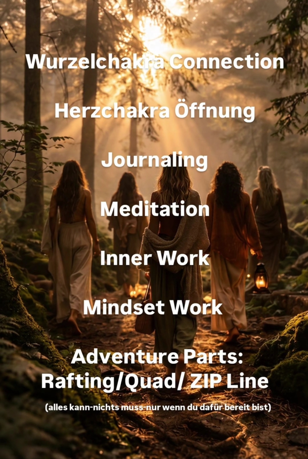 incl. 3 Übernachtungen, Frühstück/Mittag/Abendessen, Flughafentransport hin-und zurück, Workshops, Meditationen, Rafting, Quad & Überraschung